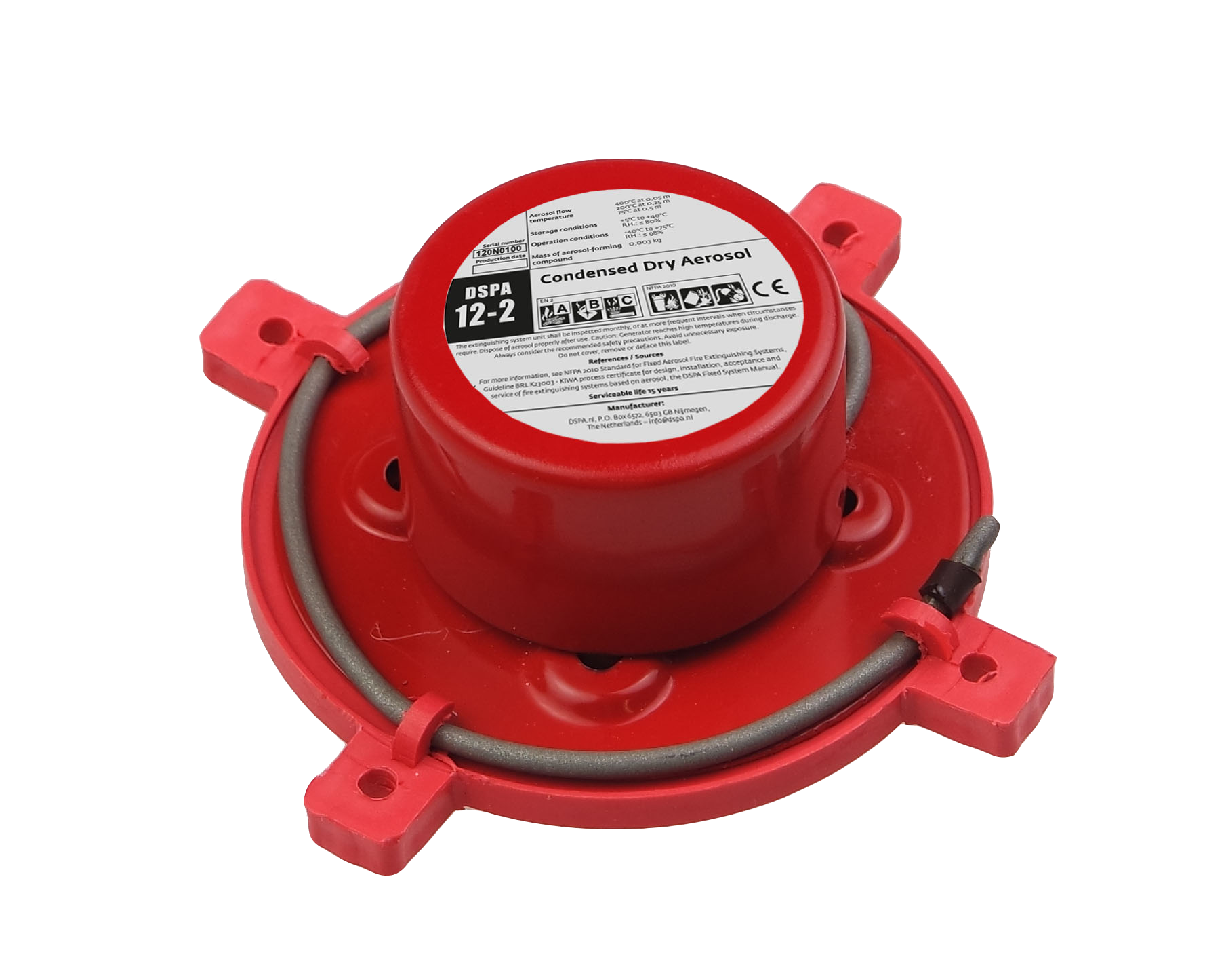 Aerosol DSPA 12-2 kann als hochwirksames ortsfestes Löschsystem eingesetzt werden. Ein DSPA-Generator steht nicht unter Druck und wird in einem Raum oder Abschnitt installiert, der geschützt werden muss. Nach der Aktivierung wird eine Aerosolwolke erzeugt, die sich volumetrisch ausbreitet, den Raum überflutet und das Feuer löscht. Die DSPA-Generatoren sind hauptsächlich für den Einsatz in normalerweise unbesetzten Bereichen ausgelegt und sind bei Bränden der Klassen A, B, C und F wirksam.